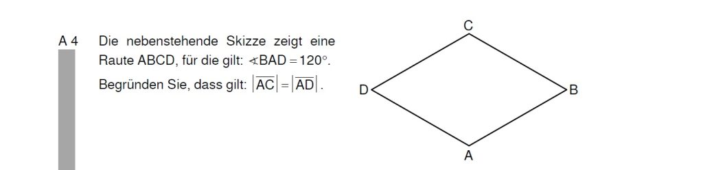 Weil die Diagonale eine Spiegelachse ist, halbiert AC den 120°-Winkel auf beiden Seiten. Das Dreieck ACD hat also A und bei C einen 60°- Winkel.