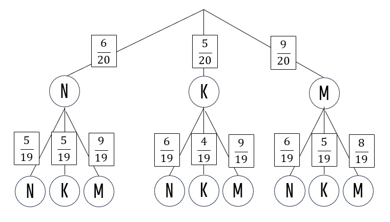 P(K|N) &= \frac{5}{20} \cdot \frac{6}{19} = \frac{30}{380} \\ \\