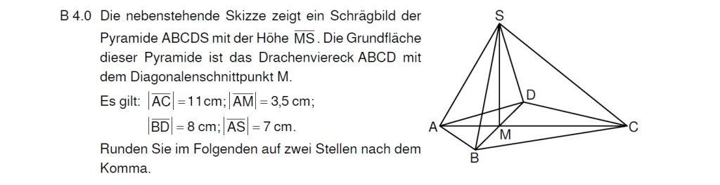 Die Höhe steht in der Pyramide senkrecht, also kannst du mit Sin/Cos/Tan und des mSatz des Pythagoras rechnen. Ich rechne hier zuerst die Höhe aus, um dann mit dem Satz des Pythagoras weitermachen zu können, aber du könntest auch in der Reihenfolge der Aufgabe arbeiten, indem du den Cosinussatz für \( \overline{CS}\) verwendest