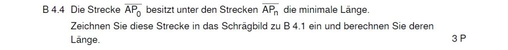 Das Stichwort minimale Länge sagt dir, dass diese Strecke senkrecht steht. Weil ein rechtwinkliges Dreieck entsteht, kannst du Sin/Cos/Tan und den Satz des Pythagoras zur Berechnung verwenden.