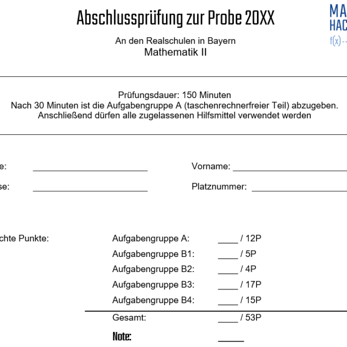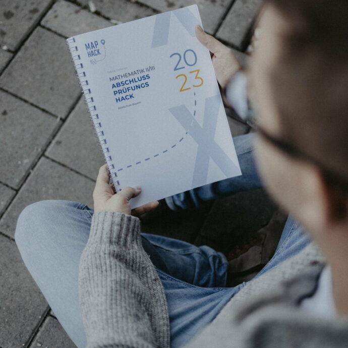 - 34 Seiten Übungsmaterial entlang der MAP-Hacks (zwei Aufgaben auf Prüfungsniveau je Themengebiet + 2 Seiten zum taschenrechnerfreien Teil